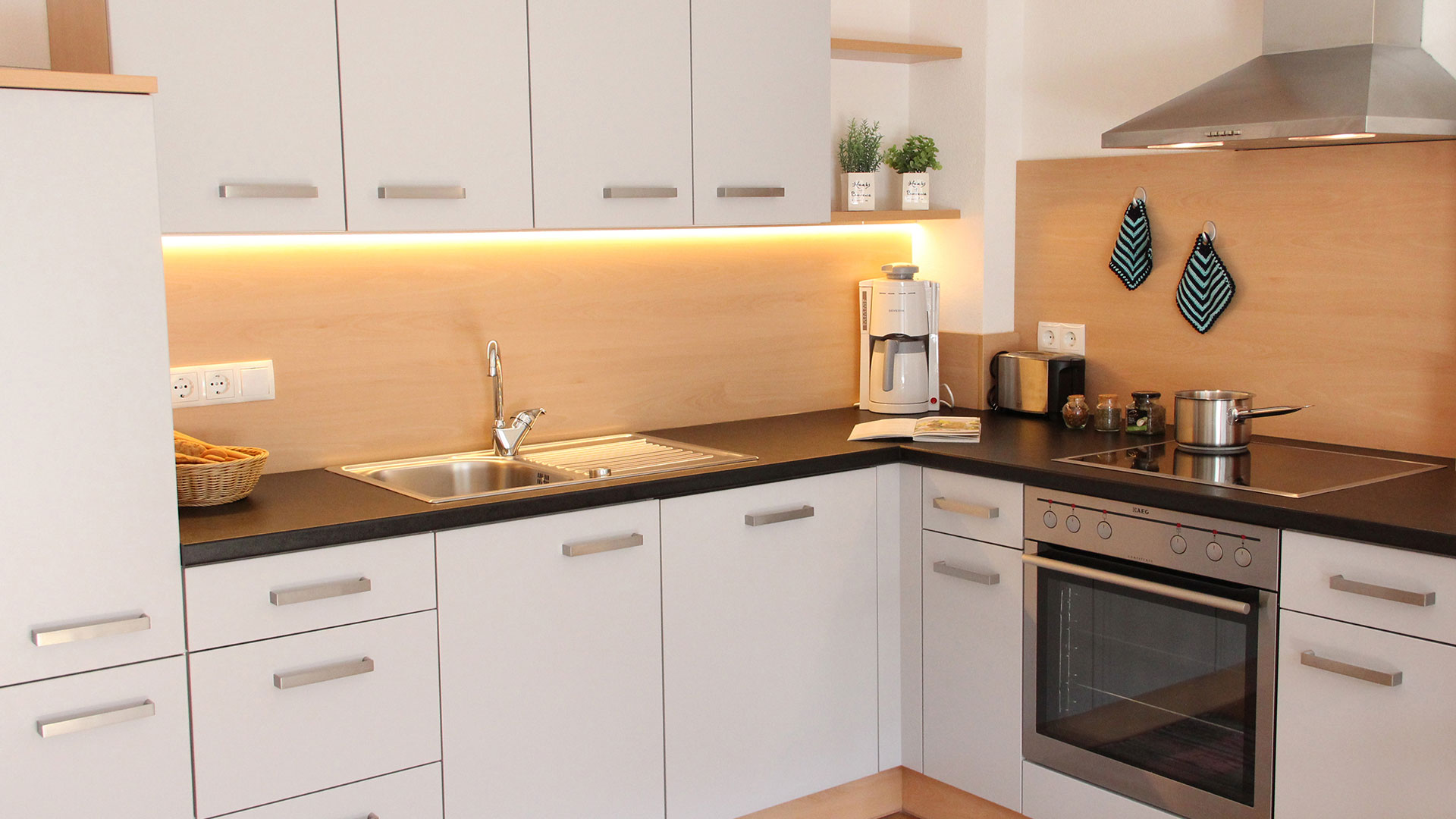 • Komplett eingerichtete Küche mit Spülmaschine, Toaster, Wasserkocher, Mikrowelle, Elektroherd, Backrohr, Mokka, und Kaffeemaschine. Alle Kochutensilien sowie Geschirrtücher sind vorhanden.